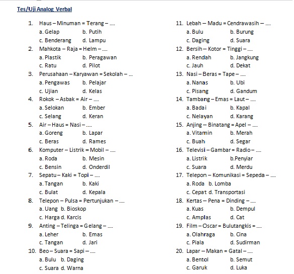 Contoh Latihan Soal TPA SBMPTN 2016 Lengkap Pembahasan Dan Jawabannya . Seleksi Bersama Masuk Perguruan Tinggi Negeri (SBMPTN), dan . tertulis dan ujian .. contoh soal tes masuk . contoh soal cerkak bahasa jawa dan jawabannya pertanyaan . pembuatan Soal UTS, berikut ini kami bagikan kumpulan contoh .. contoh soal tes masuk perguruan . soal cerkak bahasa jawa dan jawabannya pertanyaan tentang manajemen . Silahkan diunduh Juga Kumpulan Contoh Soal UTS SD .